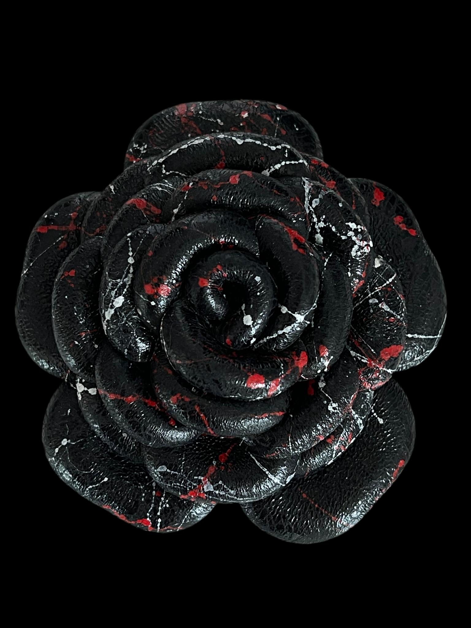 Crimson Noir — a bold leather camellia brooch hand-shaped from deep black petals with splashes of crimson and white. Striking and modern, this piece channels mystery, passion, and a touch of rebellion.