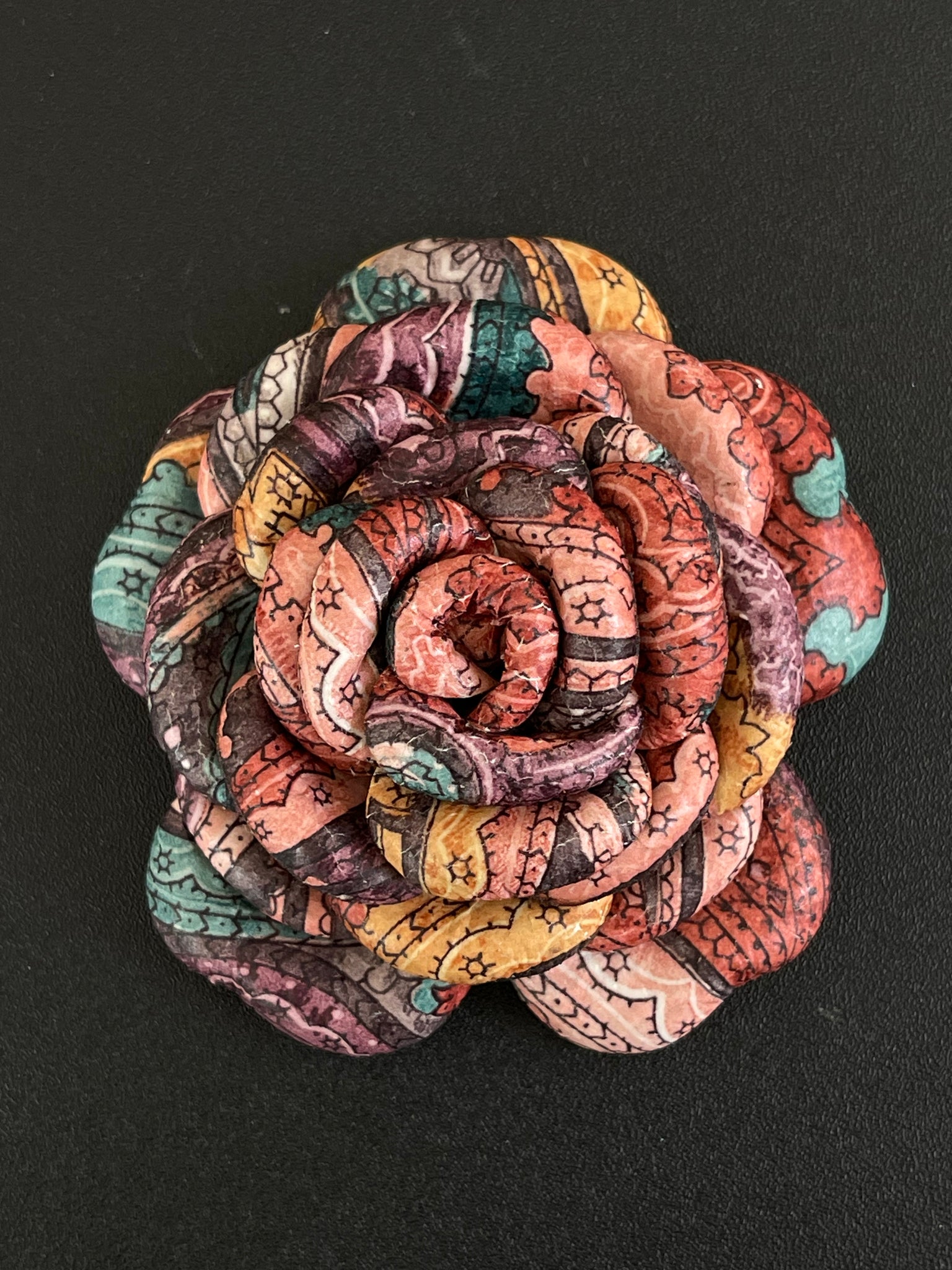 A timeless flower captured in patterned leather. The intricate textures and warm, earthy colors bring an artistic elegance to any outfit.