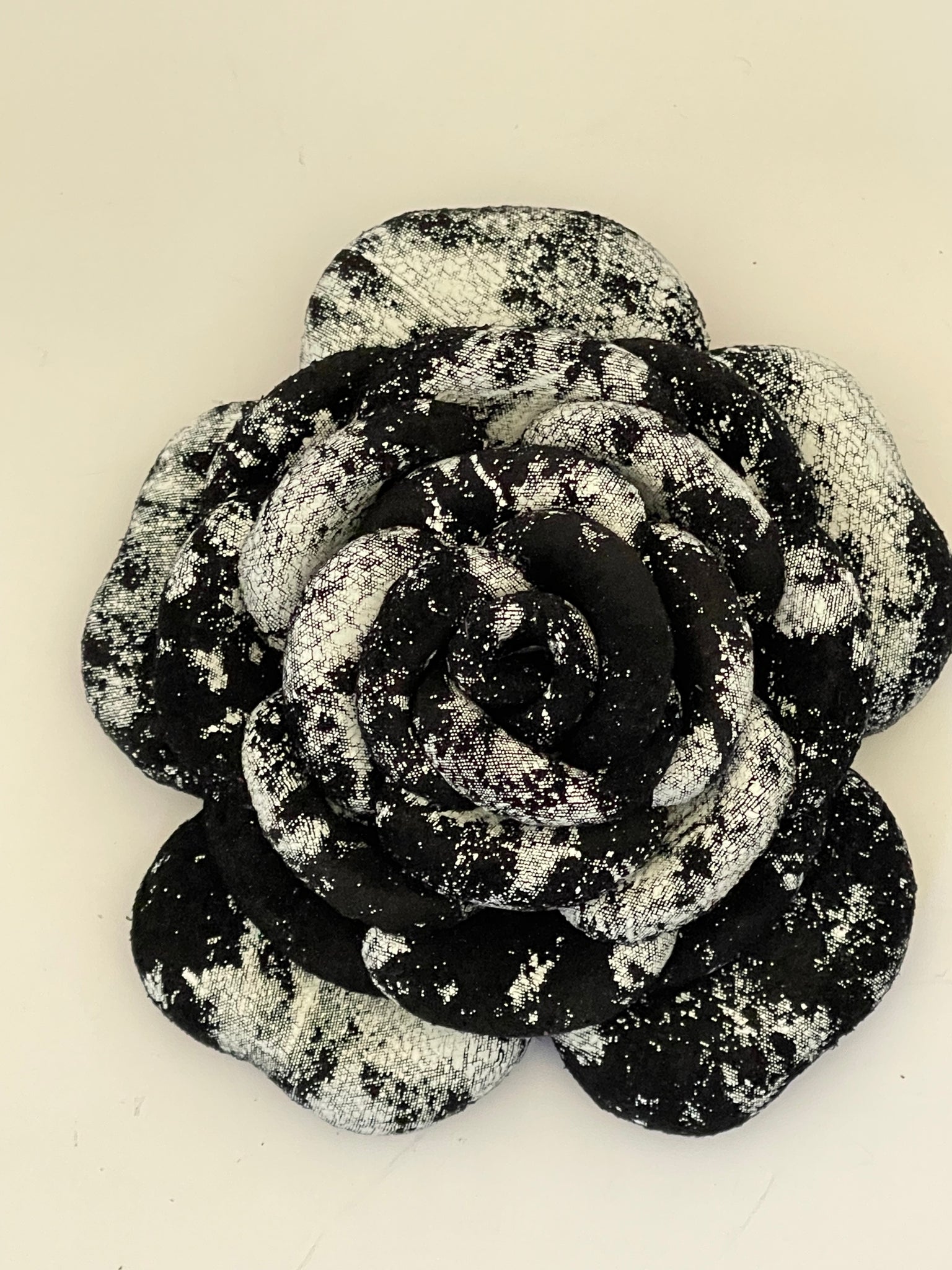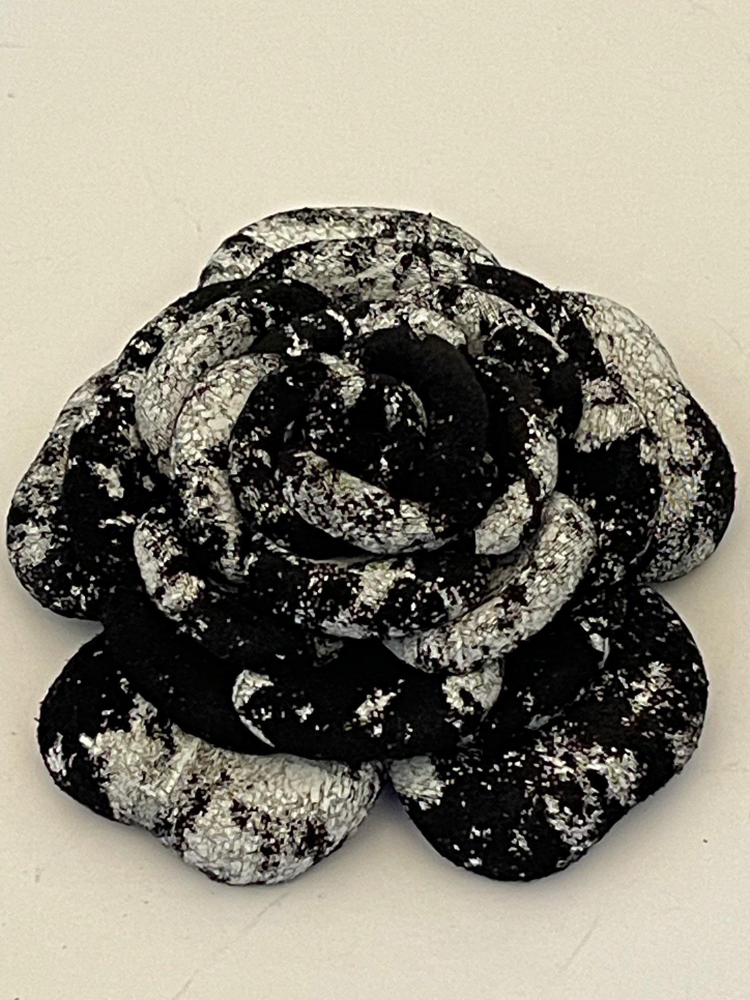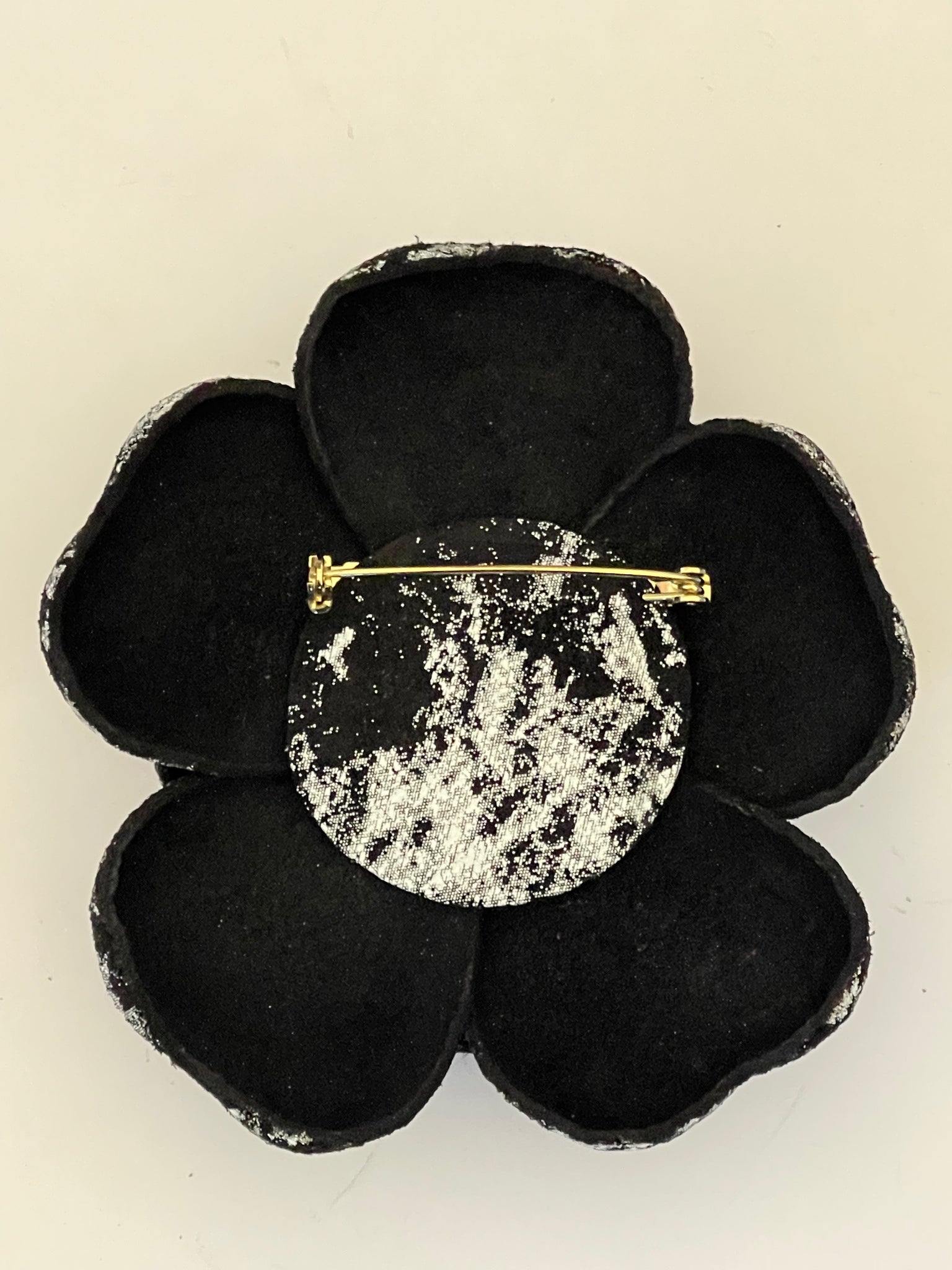 Glimmering Night is a handcrafted leather flower brooch where deep black meets shimmering silver—like a quiet night sky lit by a distant moon.