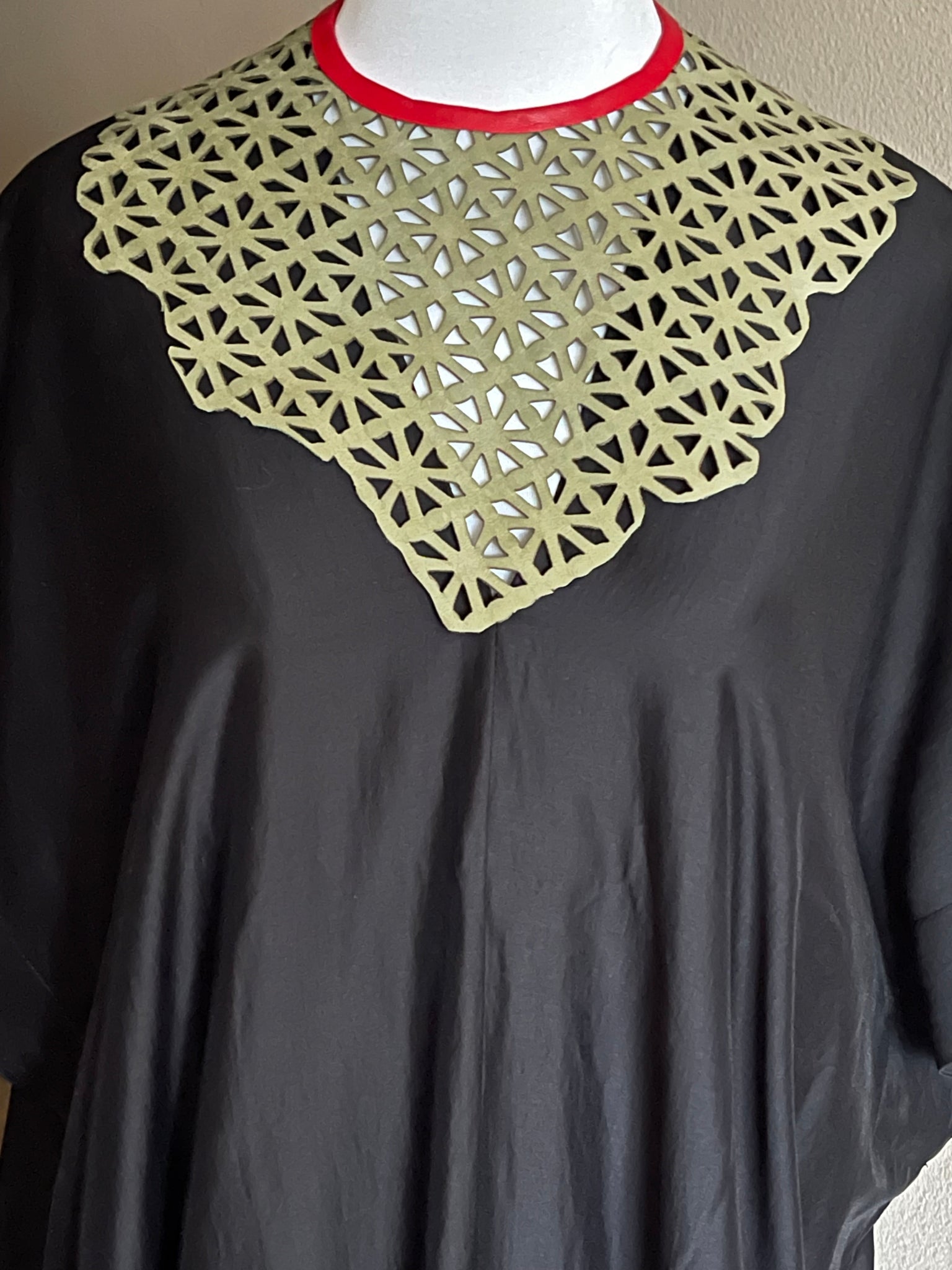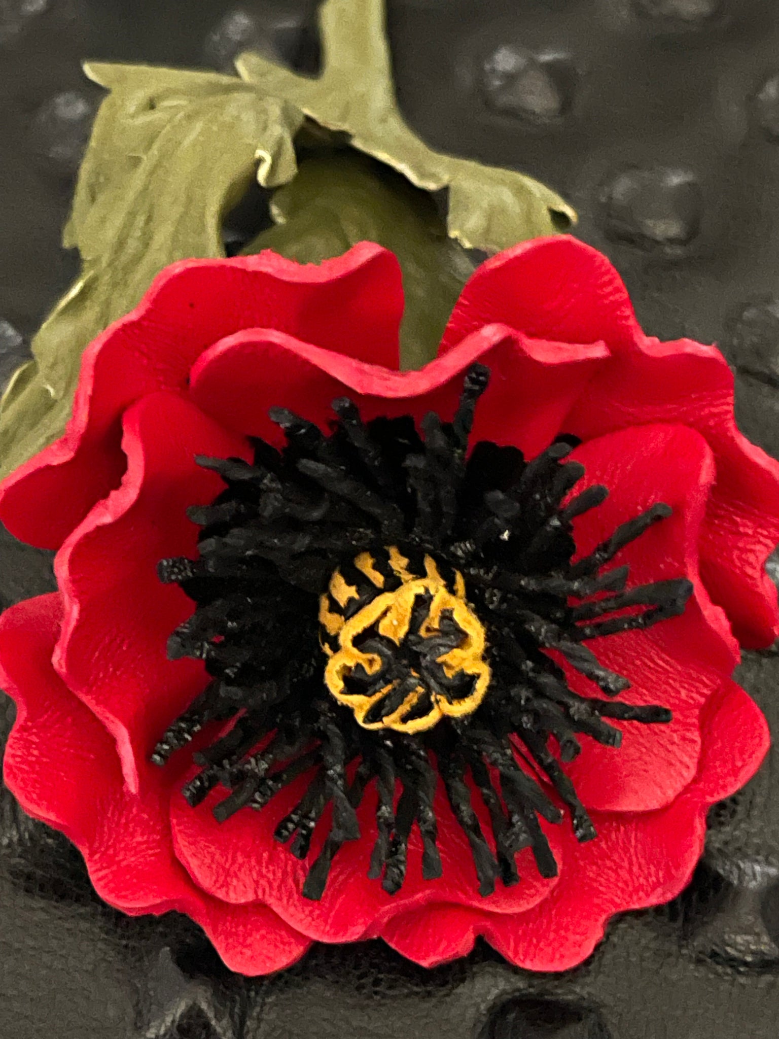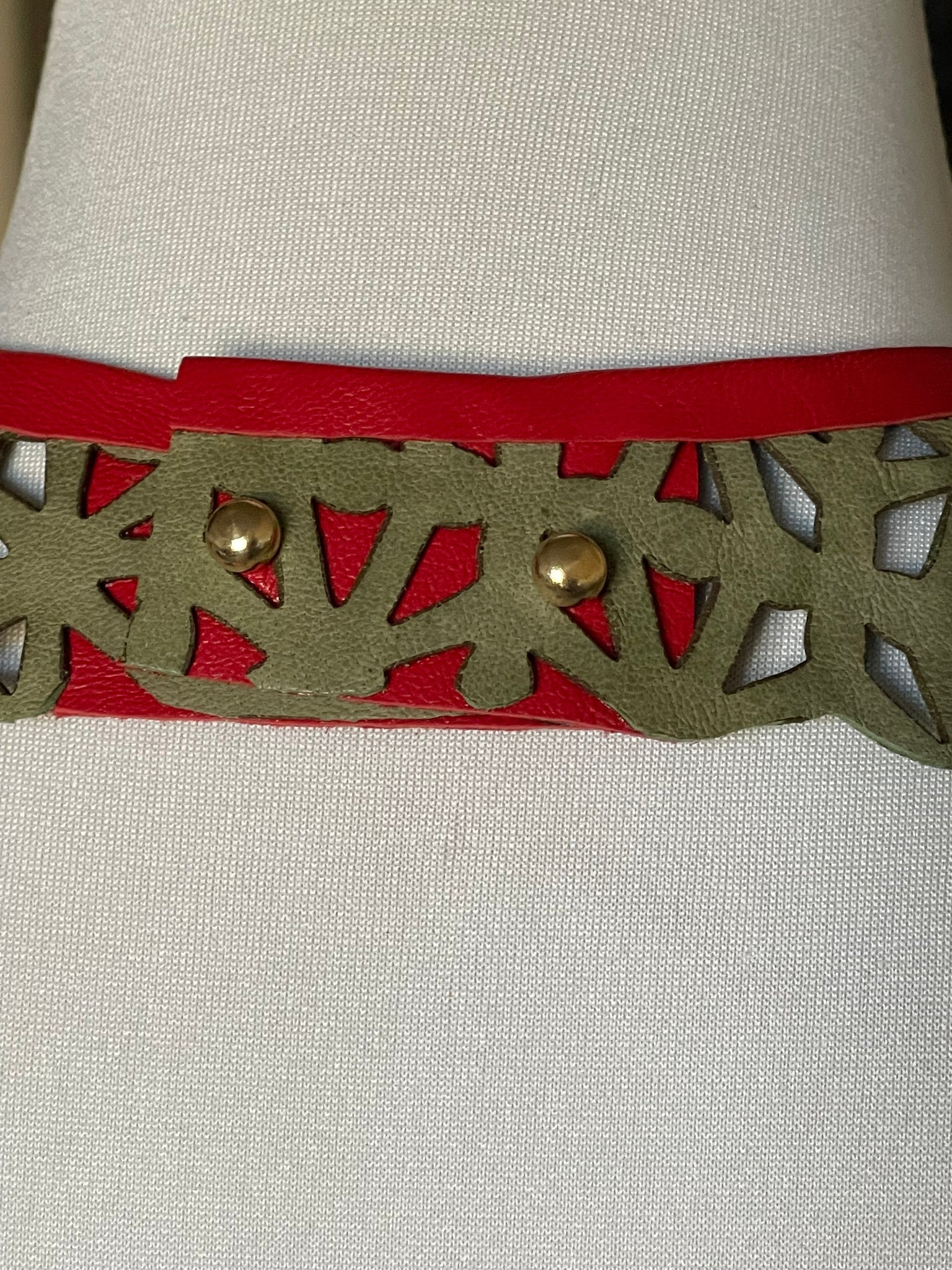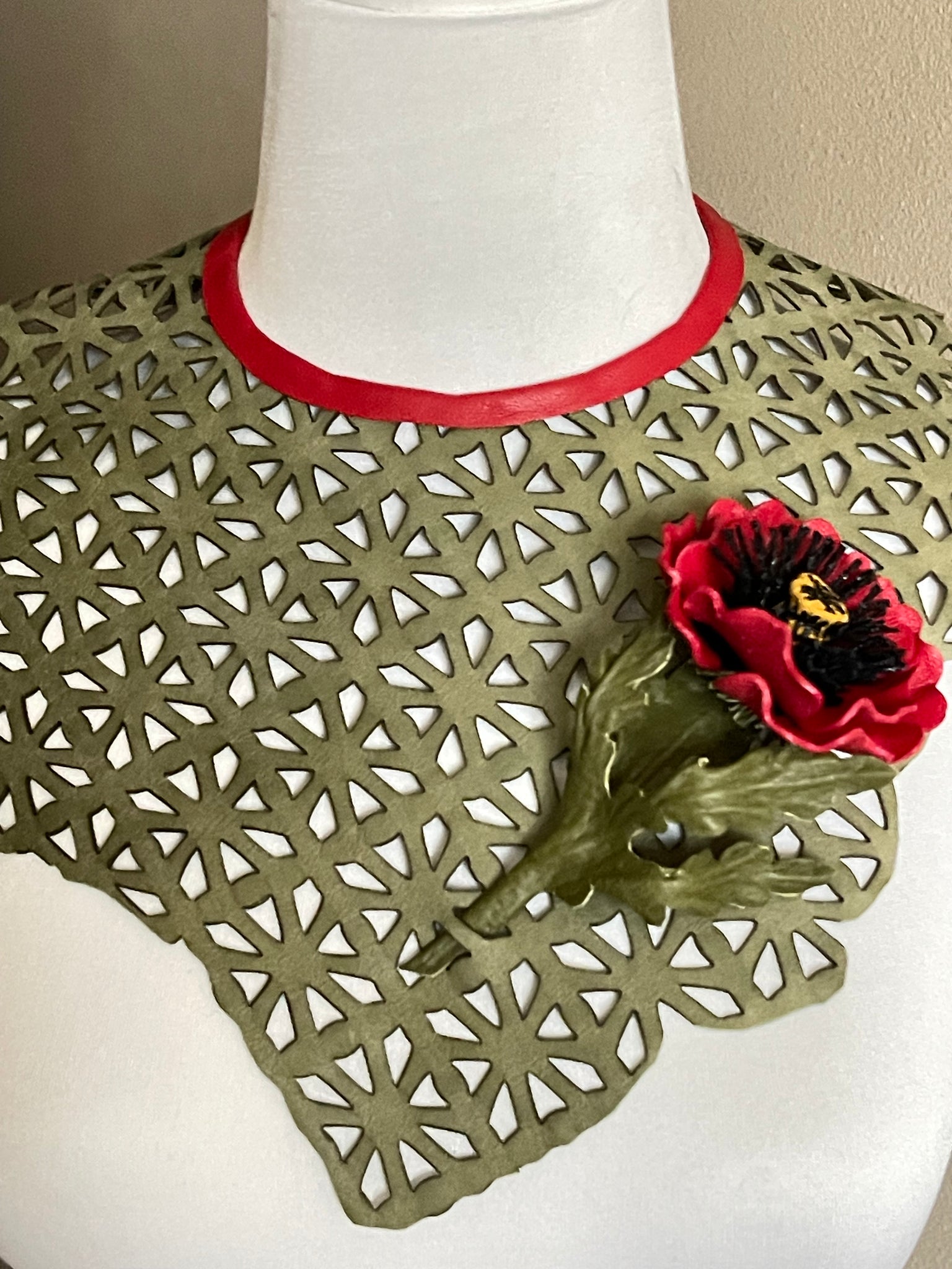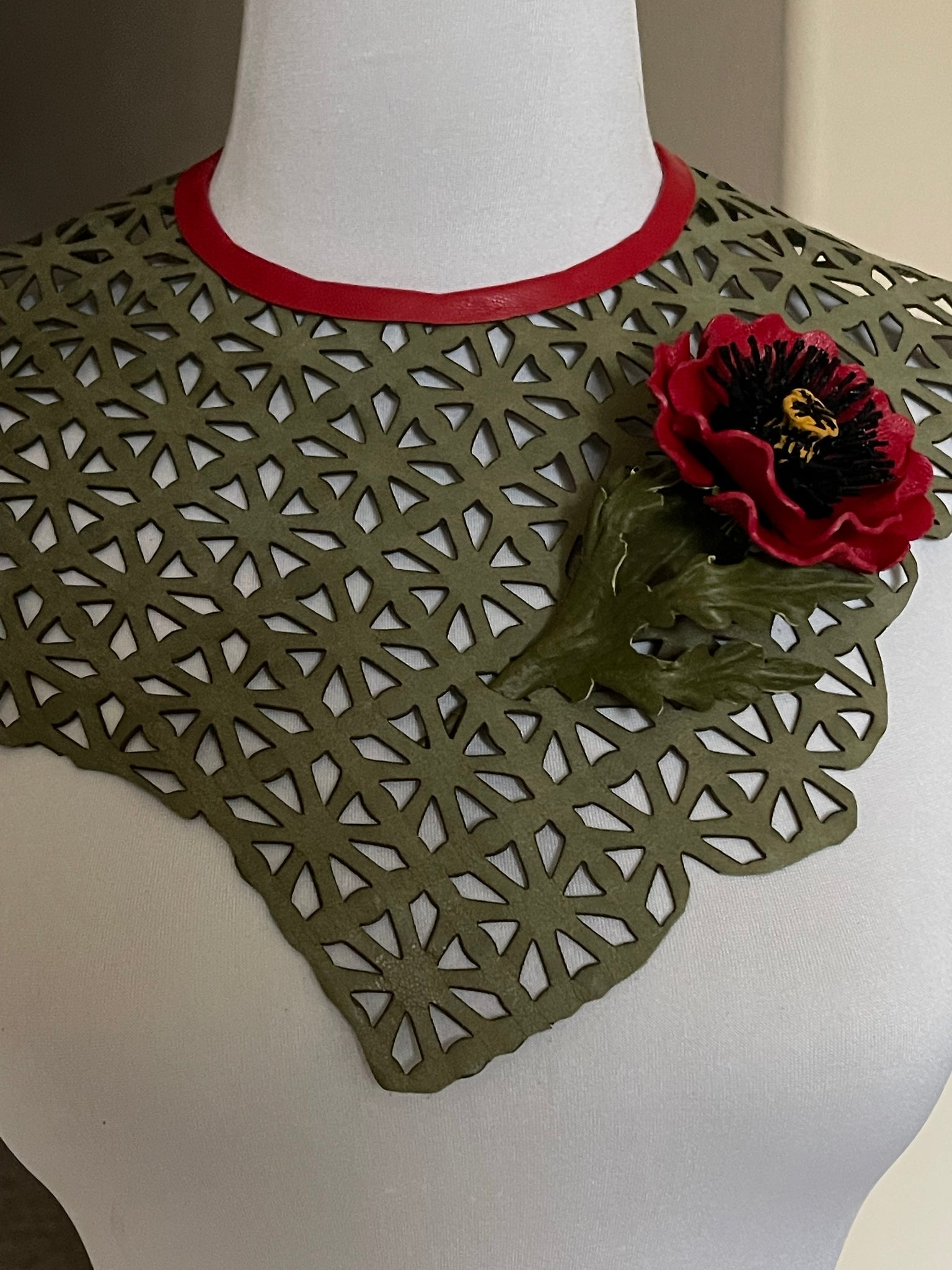 A bold leather collar crafted from olive green leather with an intricate geometric cut-out design, accentuated by a vivid red trim and a handcrafted leather poppy. This striking piece blends architectural precision with organic elegance, making it a true statement accessory. Perfect for those who wear art, not just fashion.
