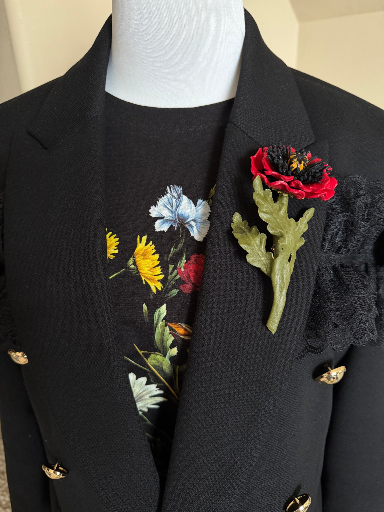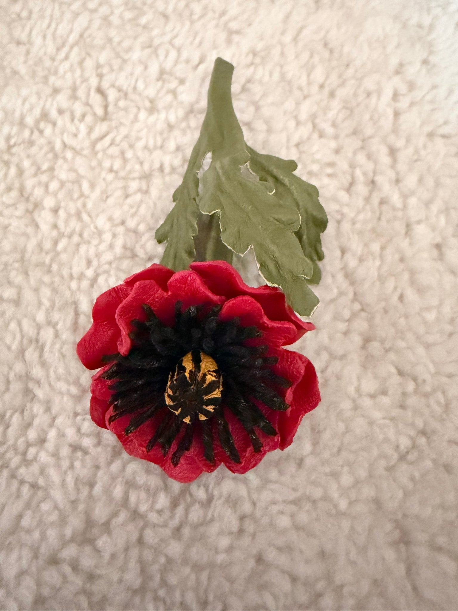 Crimson Poppy is a handcrafted leather flower brooch inspired by the bold, untamed beauty of wild poppies.