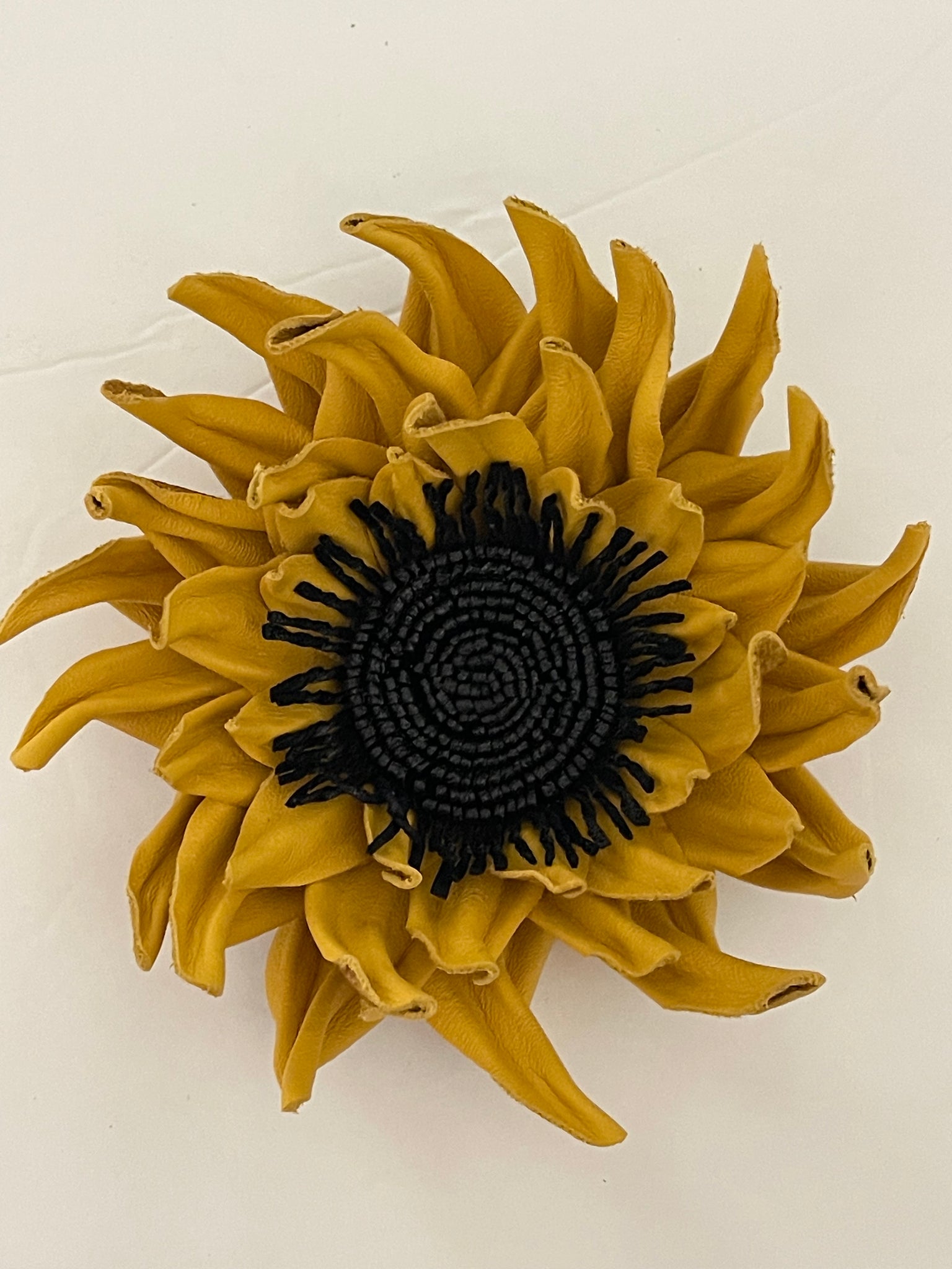 A striking handmade brooch in the shape of a sunflower, crafted from genuine leather. Measuring 5,5 inches in diameter, it captures the warmth and vibrance of the sun with its bold golden petals and textured black center. This statement accessory brings a touch of natural elegance and joy to any outfit, symbolizing light, strength, and positivity.