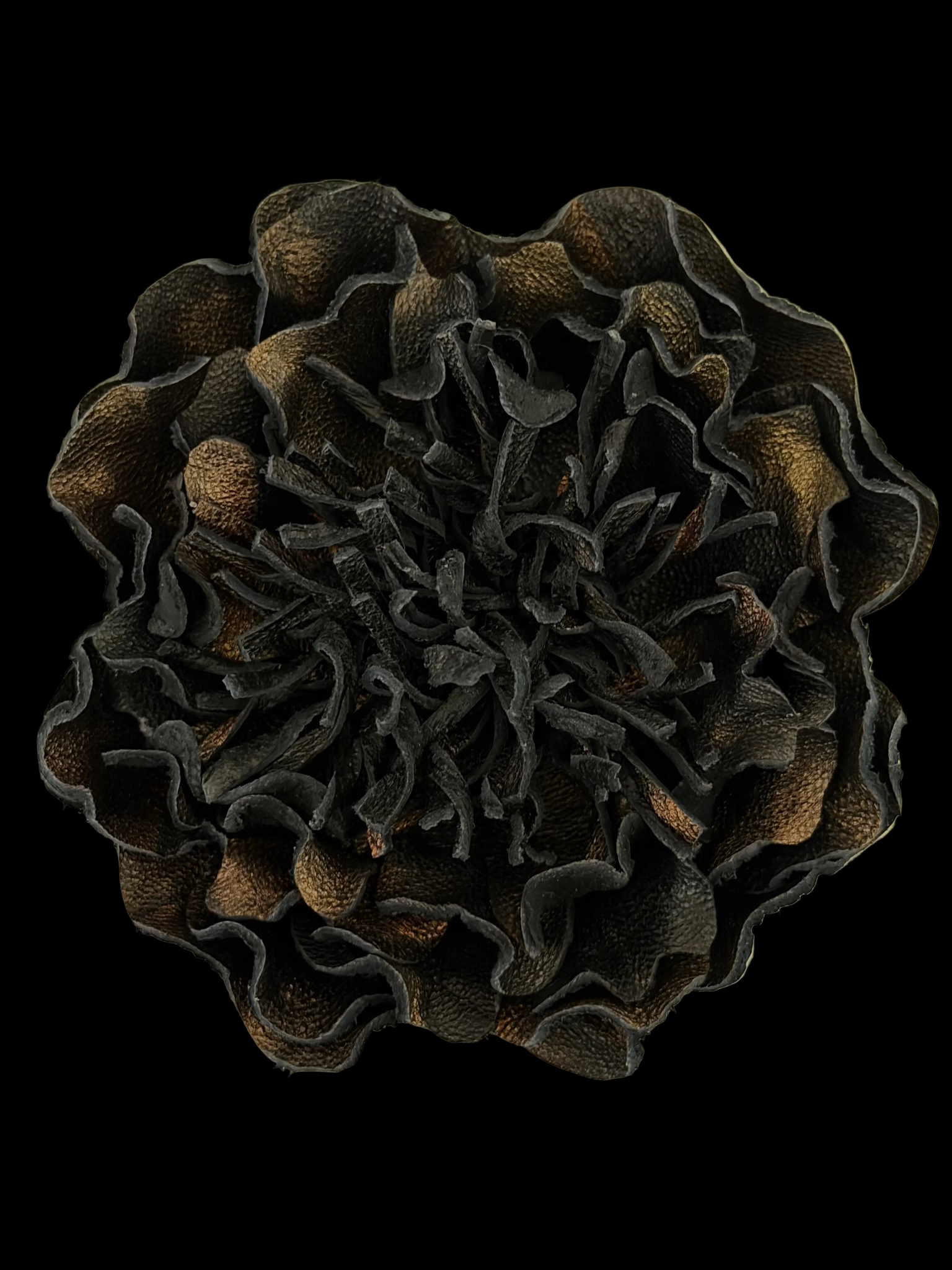 This luxurious black leather peony is hand-shaped petal by petal and finished with a subtle gold sheen, creating a dramatic contrast of depth and light. Each piece is one of a kind, designed to bring elegance, strength, and timeless beauty to your look.