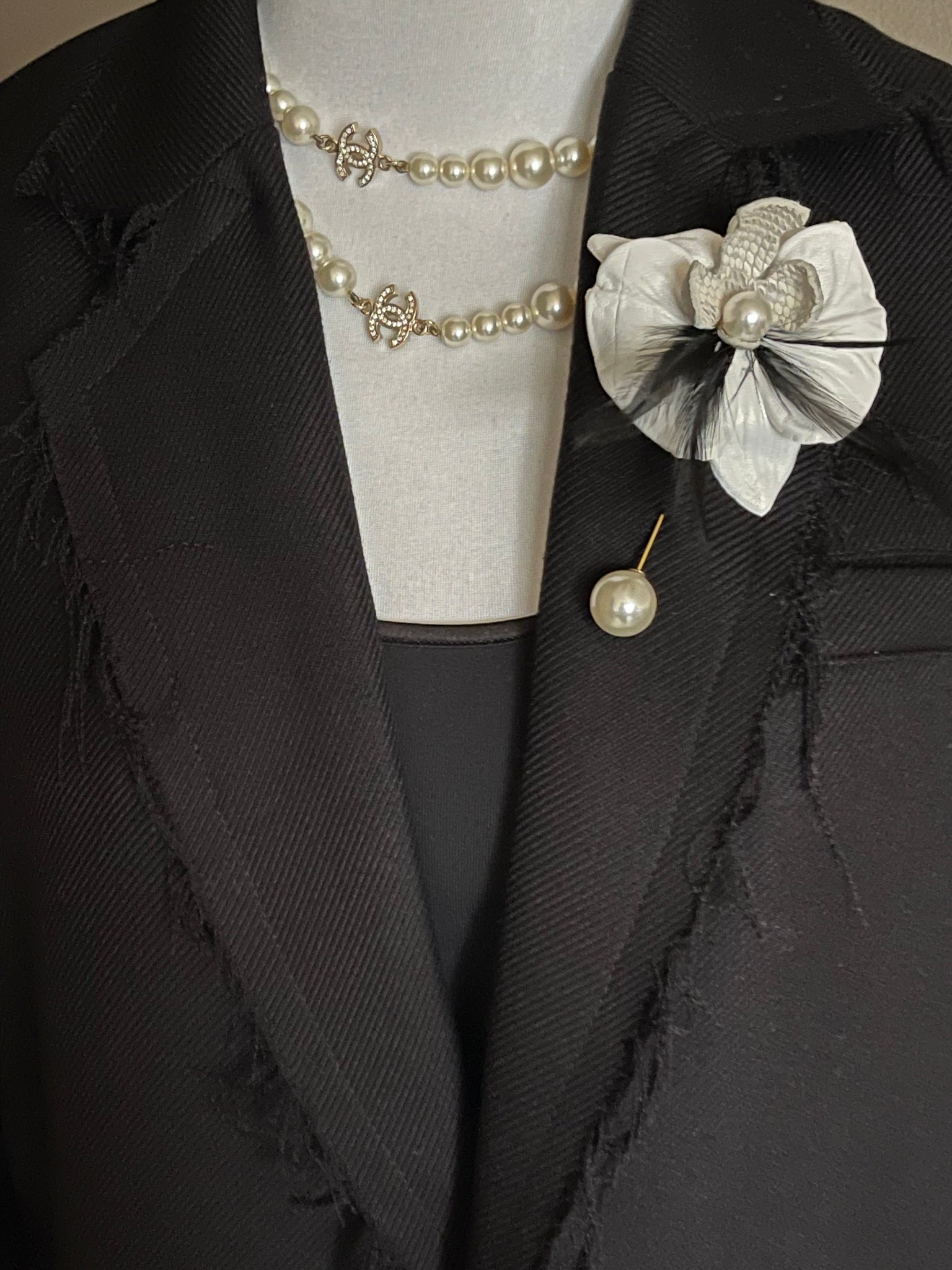 Finished with a sleek pin and pearl clasp, this piece is both poetic and wearable.